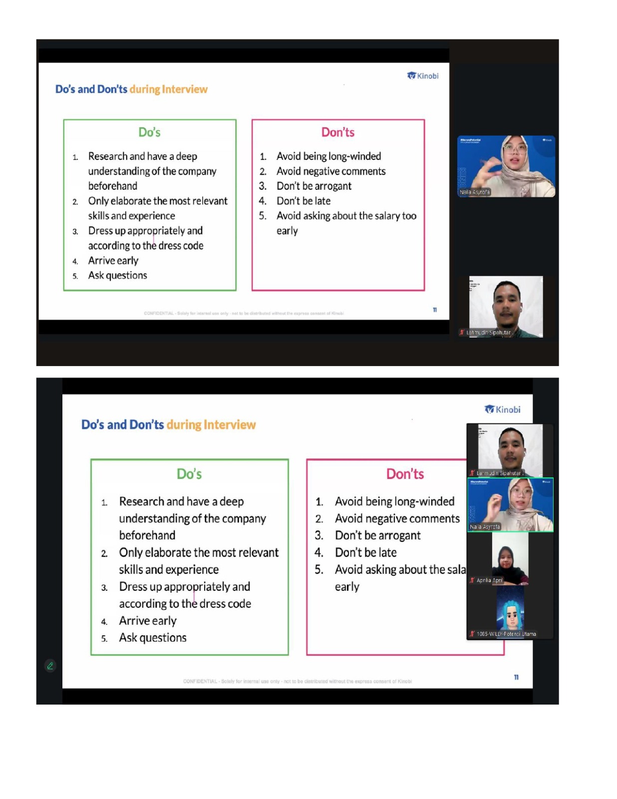 Selain itu, peserta juga diberikan wawasan mengenai cara menghadapi wawancara kerja dengan percaya diri, strategi menjawab pertanyaan interviewer dengan efektif, serta pentingnya membangun portofolio digital yang mampu menampilkan kompetensi dan pengalaman kerja secara menarik.