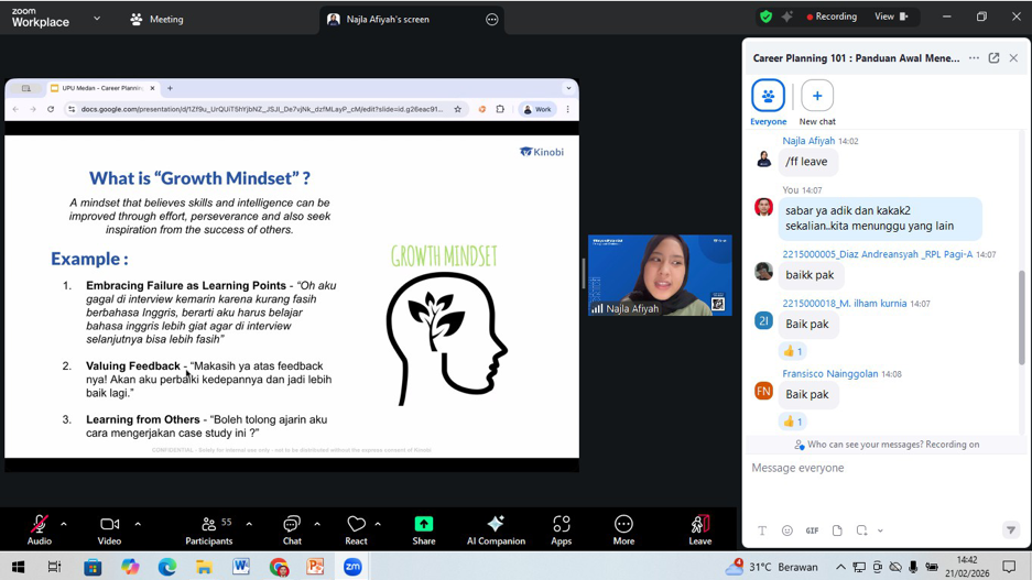Memasuki acara inti, para peserta mendapatkan paparan mendalam dari narasumber ahli, Ibu Najla Afiyah, selaku Customer Success Associate dari Kinobi. Dengan gaya penyampaian yang interaktif, Ibu Najla memandu peserta untuk memahami konsep dasar perencanaan karier. Materi yang disampaikan mencakup pentingnya mengenali potensi diri (minat, bakat, dan nilai-nilai pribadi), eksplorasi berbagai jalur karier yang relevan dengan latar belakang pendidikan, serta strategi pengambilan keputusan karier yang rasional dan realistis.