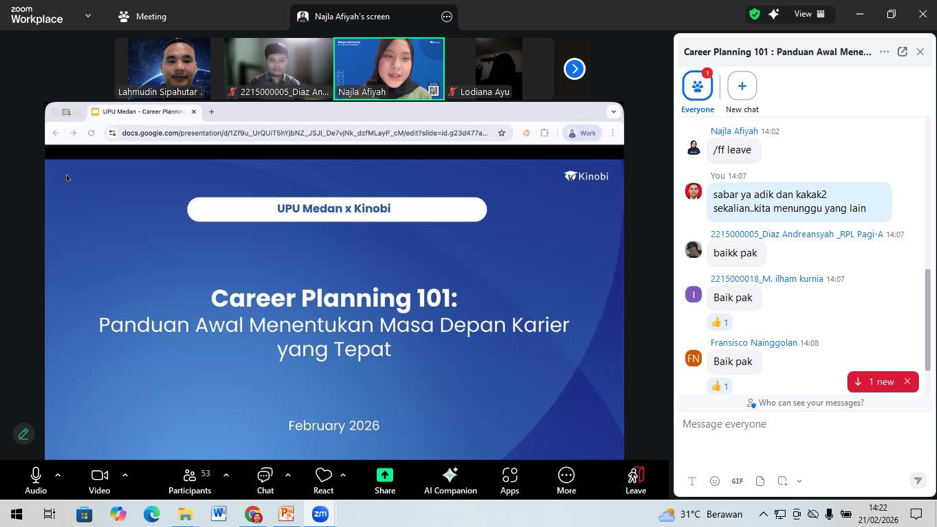 Webinar ini tidak hanya berhenti pada teori, tetapi juga mendorong peserta untuk mulai menyusun rencana awal karier yang terukur. Selain itu, kegiatan ini berhasil menumbuhkan kesadaran akan pentingnya pengembangan kompetensi diri secara berkelanjutan, baik melalui jalur pendidikan formal lanjutan, pelatihan, maupun pengalaman kerja. Aspek mental dan sikap profesional pun turut ditekankan sebagai bekal menghadapi dinamika dan persaingan di dunia kerja.