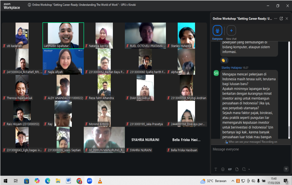 Kegiatan yang berlangsung dari pukul 14.00 hingga 16.00 WIB ini diikuti dengan antusias oleh puluhan mahasiswa dan alumni UPU. Webinar ini dirancang sebagai bekal awal bagi peserta untuk memahami pentingnya perencanaan karier yang matang, mulai dari mengenali potensi diri, memahami pilihan karier yang relevan, hingga menyusun langkah awal yang realistis sesuai kebutuhan dunia kerja saat ini dan masa depan.