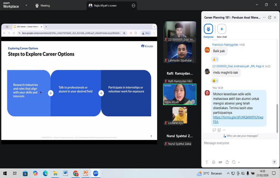 Medan, 21 Februari 2026 – Dalam upaya mempersiapkan sumber daya manusia yang unggul dan siap bersaing di dunia profesional, Universitas Potensi Utama (UPU) melalui Pusat Pengembangan Karier sukses menyelenggarakan webinar bertajuk “Career Planning 101: Panduan Awal Menentukan Masa Depan Karier yang Tepat” pada Sabtu (21/02/2026). Kegiatan yang berlangsung secara virtual melalui platform Zoom Meeting ini diikuti dengan antusias oleh puluhan mahasiswa dan alumni UPU..