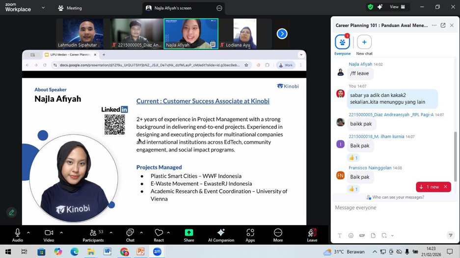 Memasuki acara inti, para peserta mendapatkan paparan mendalam dari narasumber ahli, Ibu Najla Afiyah, selaku Customer Success Associate dari Kinobi. Dengan gaya penyampaian yang interaktif, Ibu Najla memandu peserta untuk memahami konsep dasar perencanaan karier. Materi yang disampaikan mencakup pentingnya mengenali potensi diri (minat, bakat, dan nilai-nilai pribadi), eksplorasi berbagai jalur karier yang relevan dengan latar belakang pendidikan, serta strategi pengambilan keputusan karier yang rasional dan realistis.