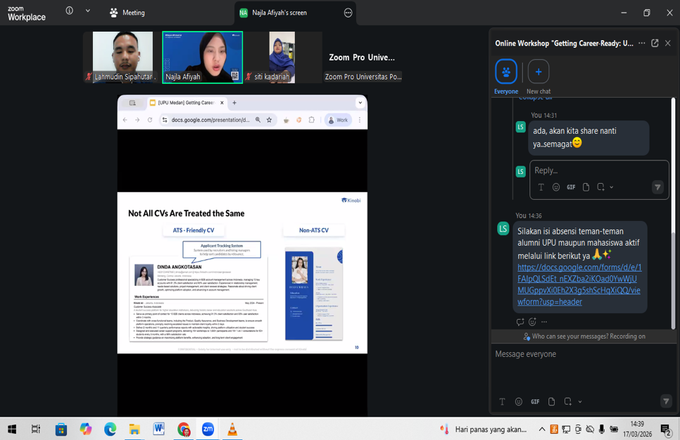 Kegiatan yang berlangsung dari pukul 14.00 hingga 16.00 WIB ini diikuti dengan antusias oleh puluhan mahasiswa dan alumni UPU. Webinar ini dirancang sebagai bekal awal bagi peserta untuk memahami pentingnya perencanaan karier yang matang, mulai dari mengenali potensi diri, memahami pilihan karier yang relevan, hingga menyusun langkah awal yang realistis sesuai kebutuhan dunia kerja saat ini dan masa depan.