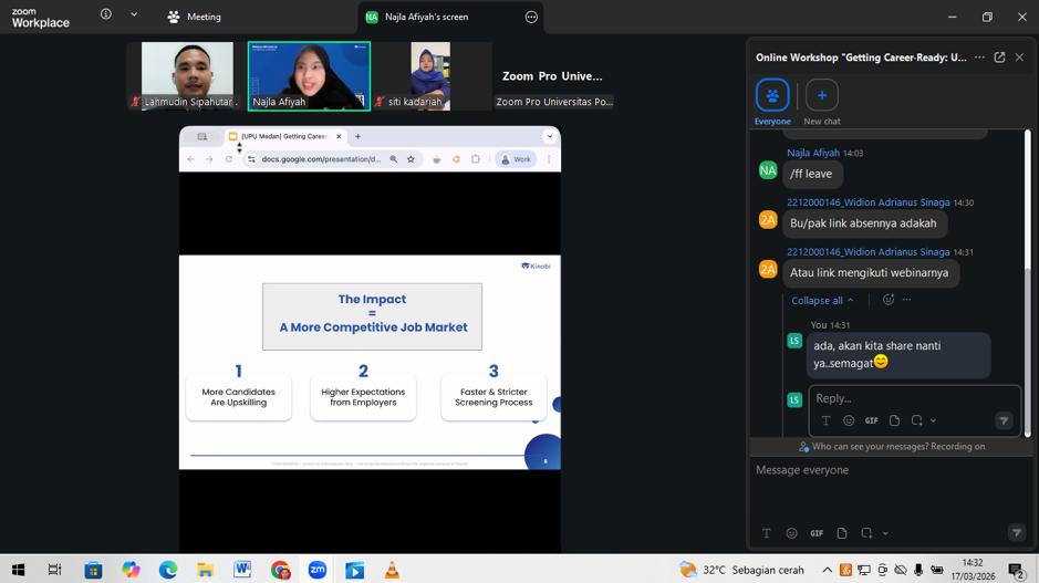 Acara inti webinar menghadirkan narasumber ahli di bidang pengembangan karier, yaitu Ibu Najla Afiyah, selaku Customer Success Associate dari Kinobi. Dalam paparannya, Ibu Najla mengupas tuntas berbagai aspek penting yang wajib dikuasai oleh para pencari kerja, antara lain: